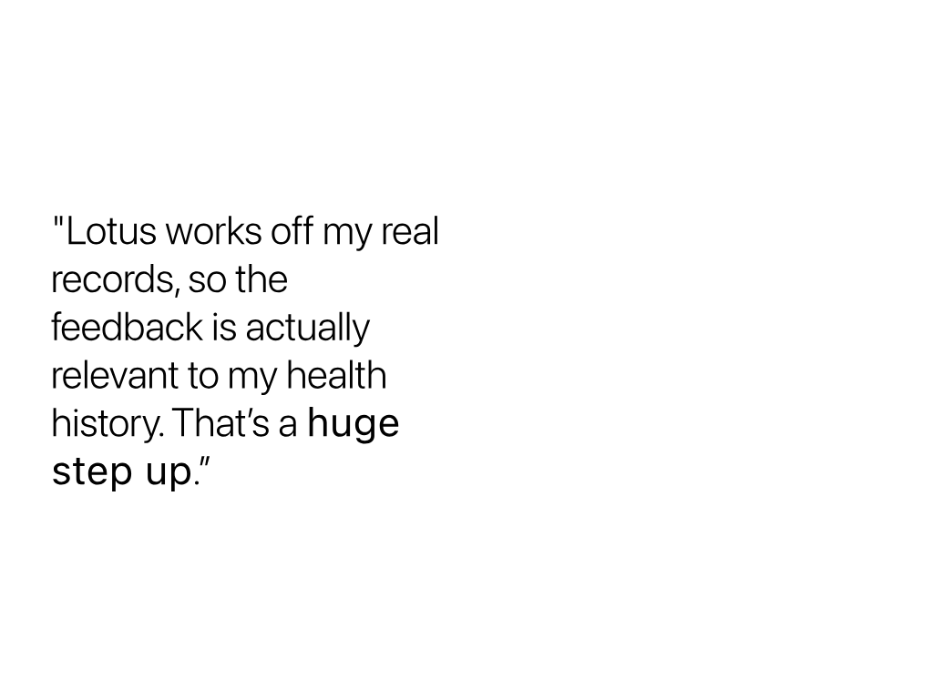 “Before, I might forget half the questions I wanted to ask. Now, I get a summary from Lotus and come in with a list. My appointments are more focused, and my doctor is able to give better advice because we’re on the same page.”